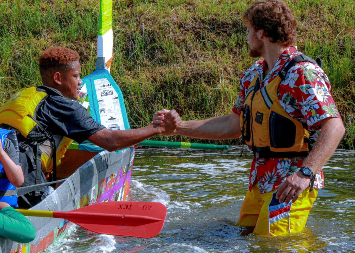 A young man stands in a lake and holds out a hand, helping wet children out of their cardboard boats. That’s love in action.